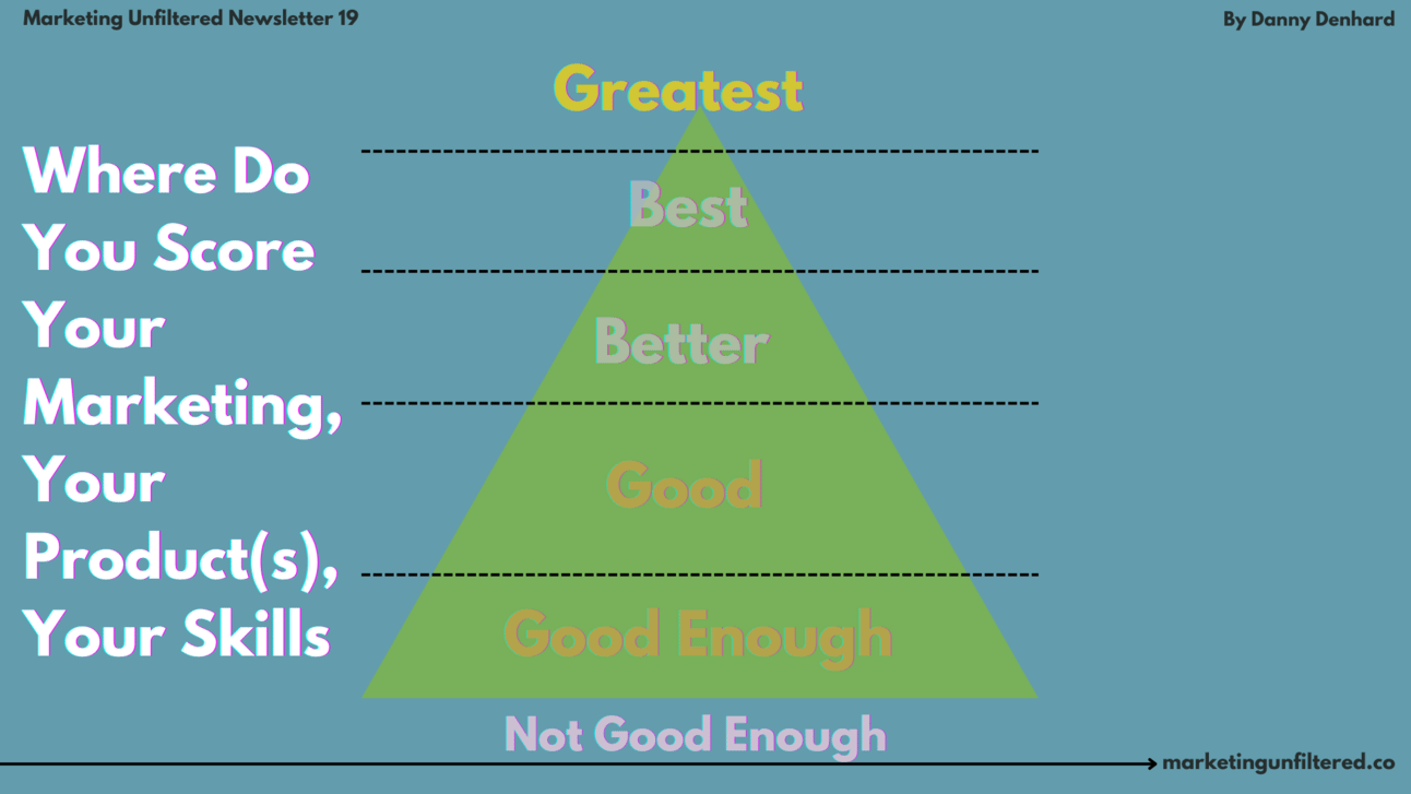 Bonus - in business there a term called good, better, best, we actually operate in a world where it is good enough, good, better, best, greatest, if you struggle to know where your product lands its likely just in good enough, if you are seeing great growth your product is likely at best. This is a strong benchmark to use when reviewing work, competitors and product/SKUs.