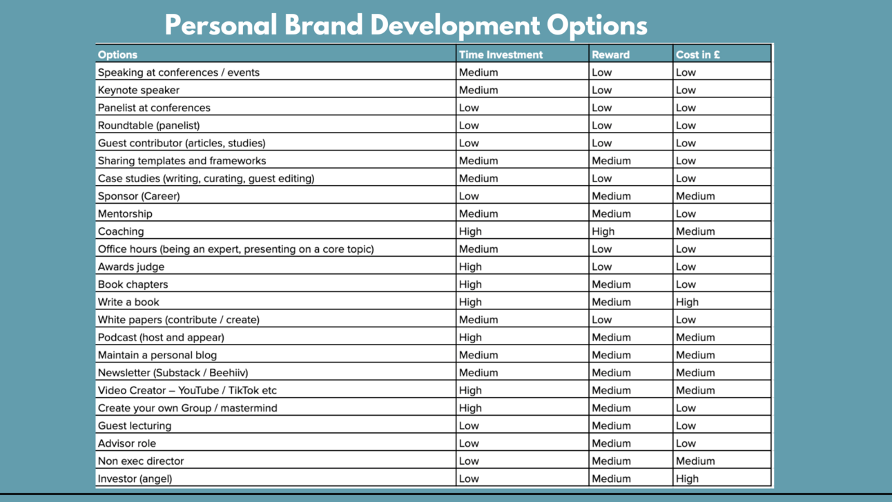 Here’s a definitive list of opportunities for developing your personal brand, the effort required, and the cost it may incur.