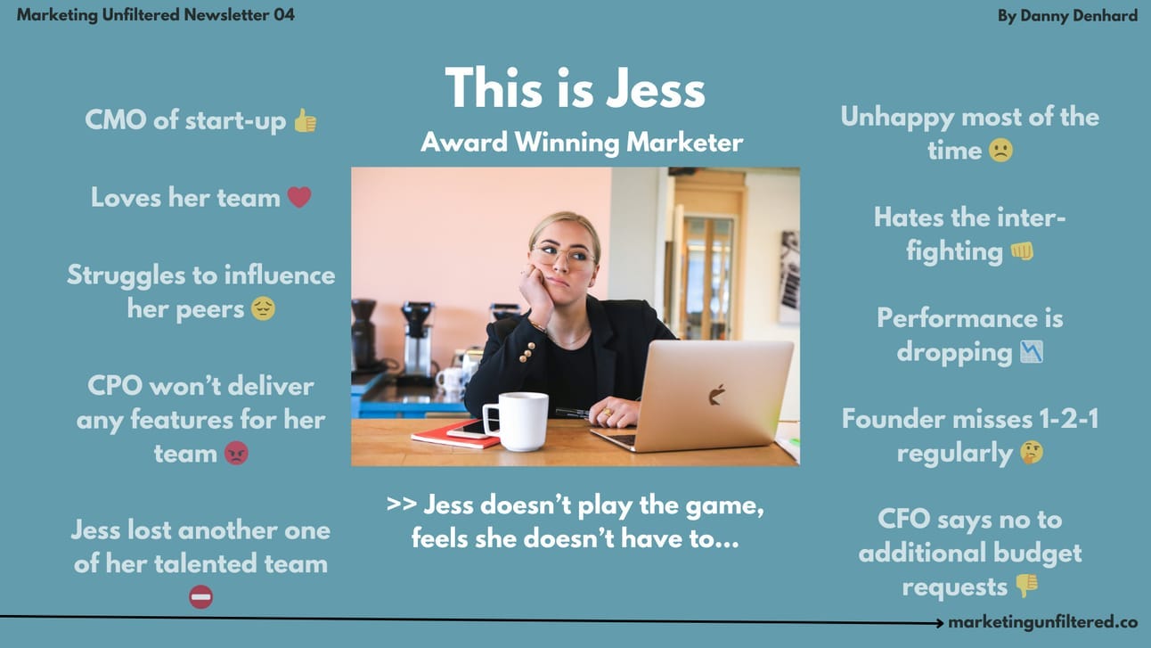 Jess is a “fictional” CMO, an award-winning marketer, she loves her team, and loves being creative & doing Marketing, BUT hates conflict, constantly battling for Product feature builds and the lack of development is negatively impacting the business. Jess struggles to influence her company despite her impressive background and the CEO isn’t convinced Jess is the person for the job so skips their 1-2-1.